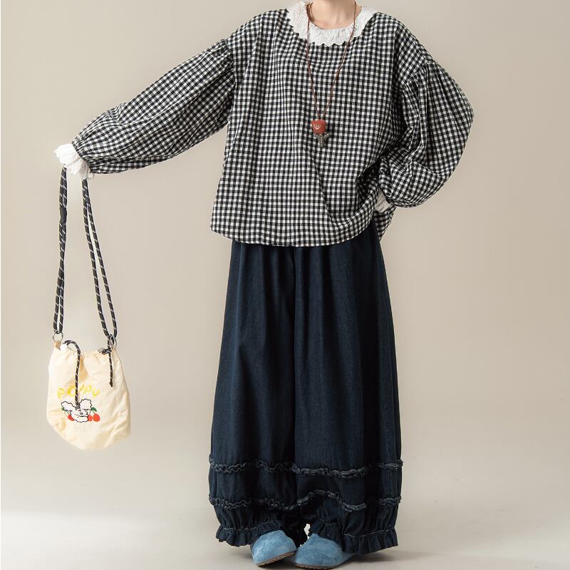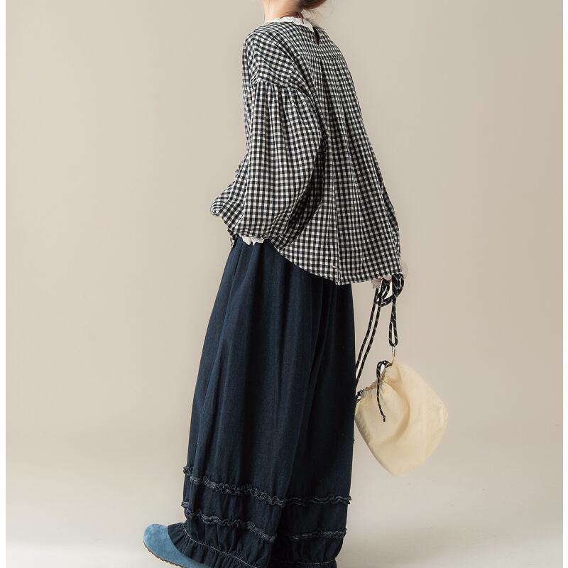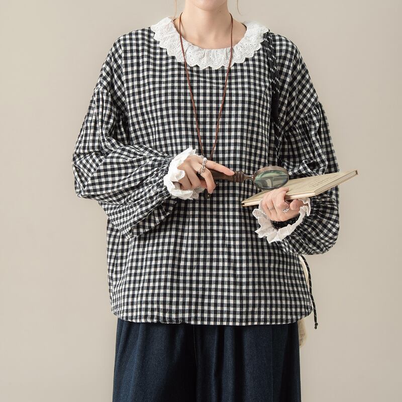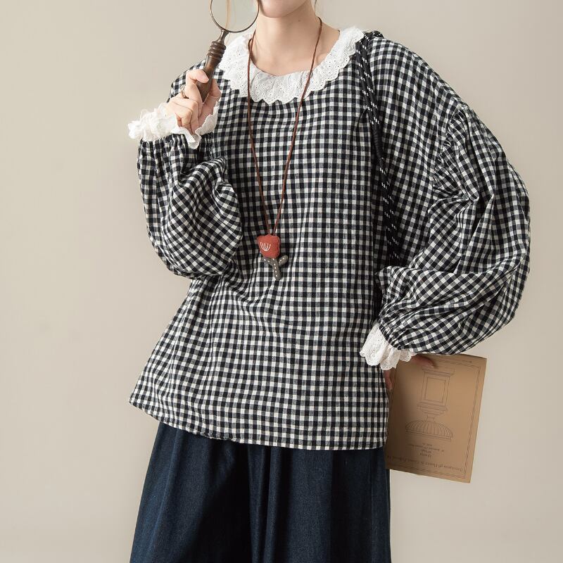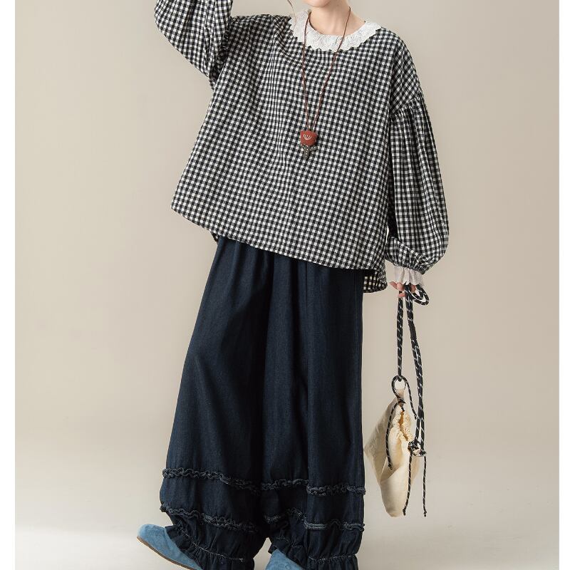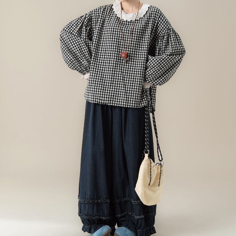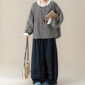 ギンガムチェック柄刺繍フリル襟ブラウス M2156