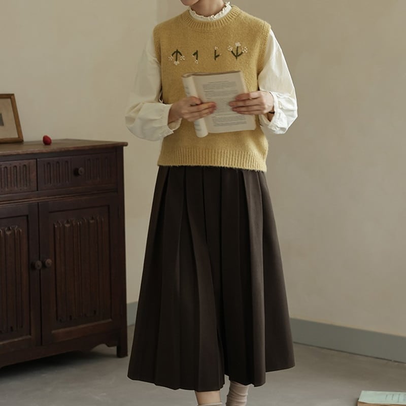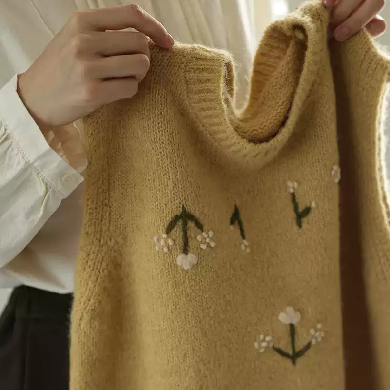 マスタードイエローに、可憐な花刺繍が映えるニットベスト。